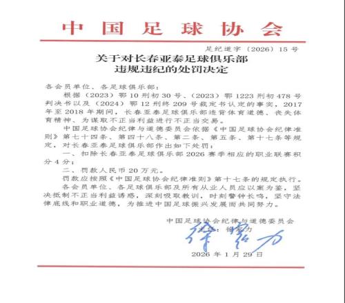 长春亚泰足球俱乐部,扣4分并罚款20万元;