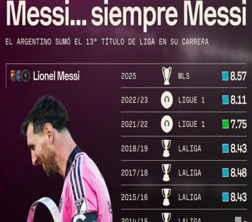 北京时间12月7日,美职联总决赛落幕,迈阿密国际3-1战胜温哥华白浪,夺得美职联总冠军。此役也为队内球星梅西带来了其职业生涯的第13座联赛冠军奖杯,其联赛夺冠纪录横跨西甲、法甲